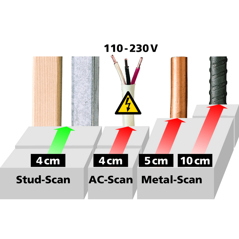 MultiFinder PRO se može postaviti na zid ili na pod i omogućava Vam da na određenim dubinama otkrijete prolaz električnih kablova, cevi, metalnih profila na primer pre bušenja.